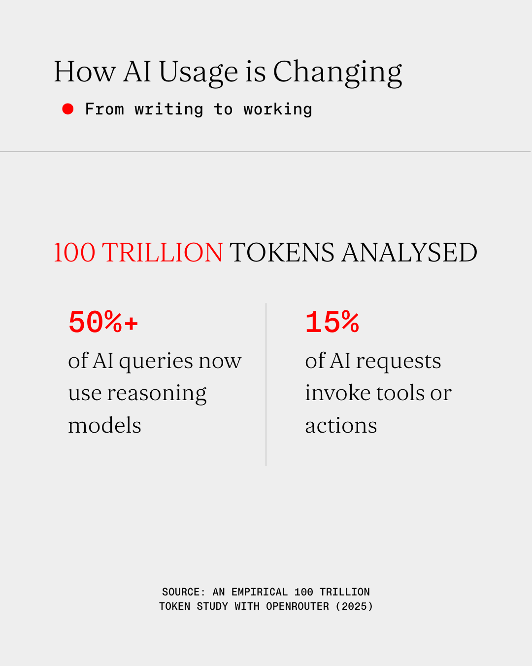 OpenRouter’s analysis of 100 trillion tokens of real-world AI usage points to a clear behavioural shift. By late 2025, over 50% of all AI queries were routed to “reasoning” models (which can plan and iterate, not just answer). Teams stopped using AI just to generate text and started using it to execute tasks and logic. Similarly, requests that invoked tools or external actions grew to ~15% of usage, indicating more AI being used in connected workflows rather than standalone Q&A. In essence, people are trying to use AI to work, not just to write.