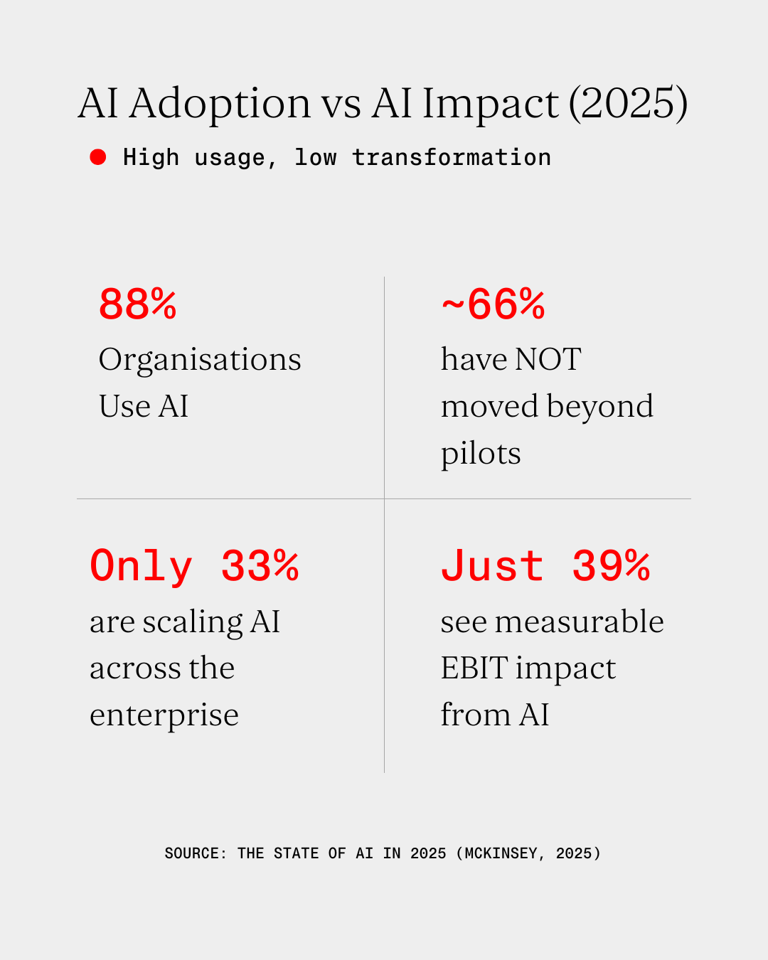 McKinsey’s latest global survey found that 88% of organisations now use AI in at least one business function, up from 78% last year. Yet almost two-thirds have not moved beyond pilots or proofs of concept. In other words, the tool might work, the demo might impress but the organisation doesn’t change. Only about one-third of firms have started scaling AI across the enterprise and even among “successful” adopters, just 39% report any measurable EBIT impact from AI at the enterprise level. In plain terms, over half of companies investing in AI aren’t seeing real money returns from it. Most “AI wins” remain isolated use-case level achievements, not broad transformation.